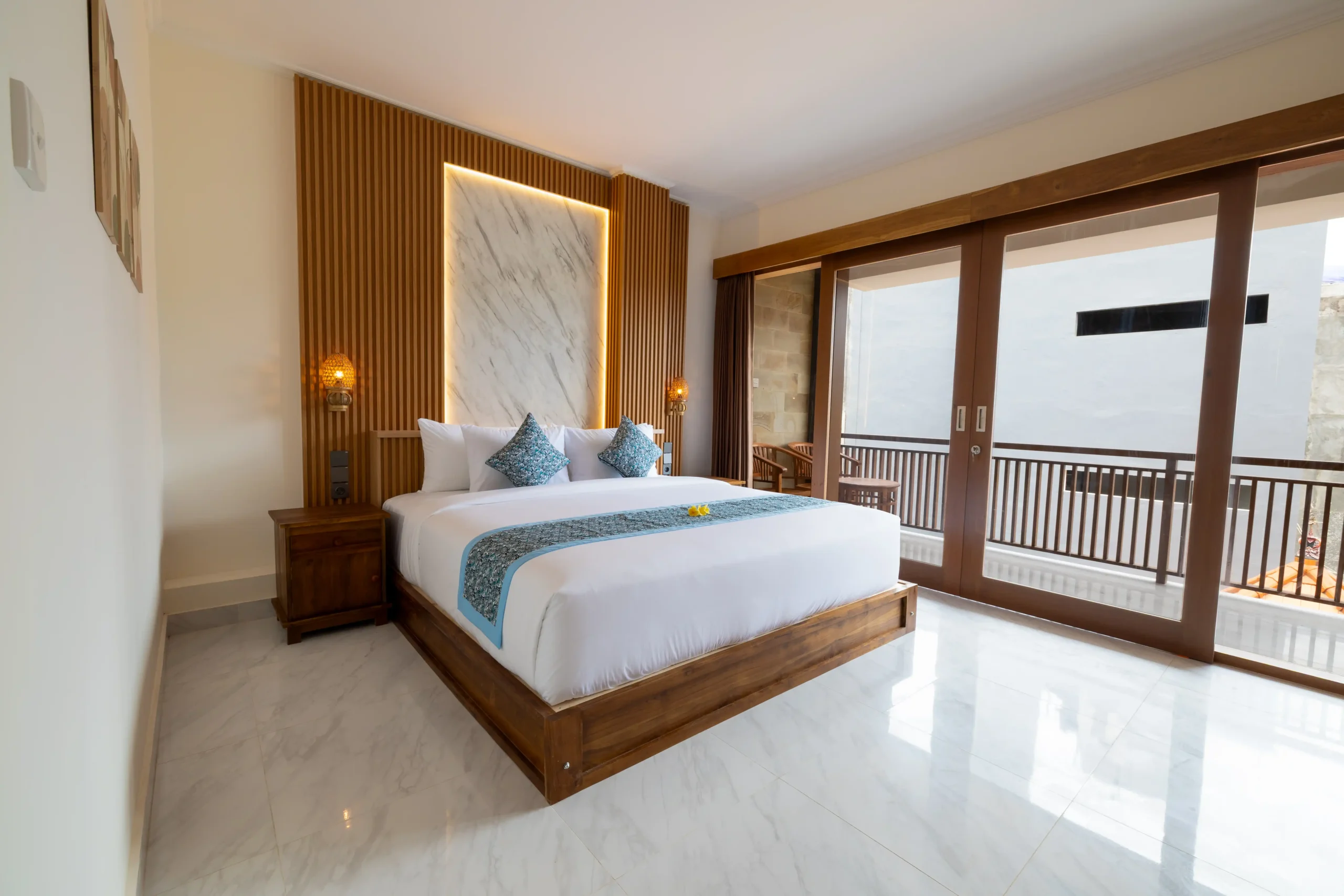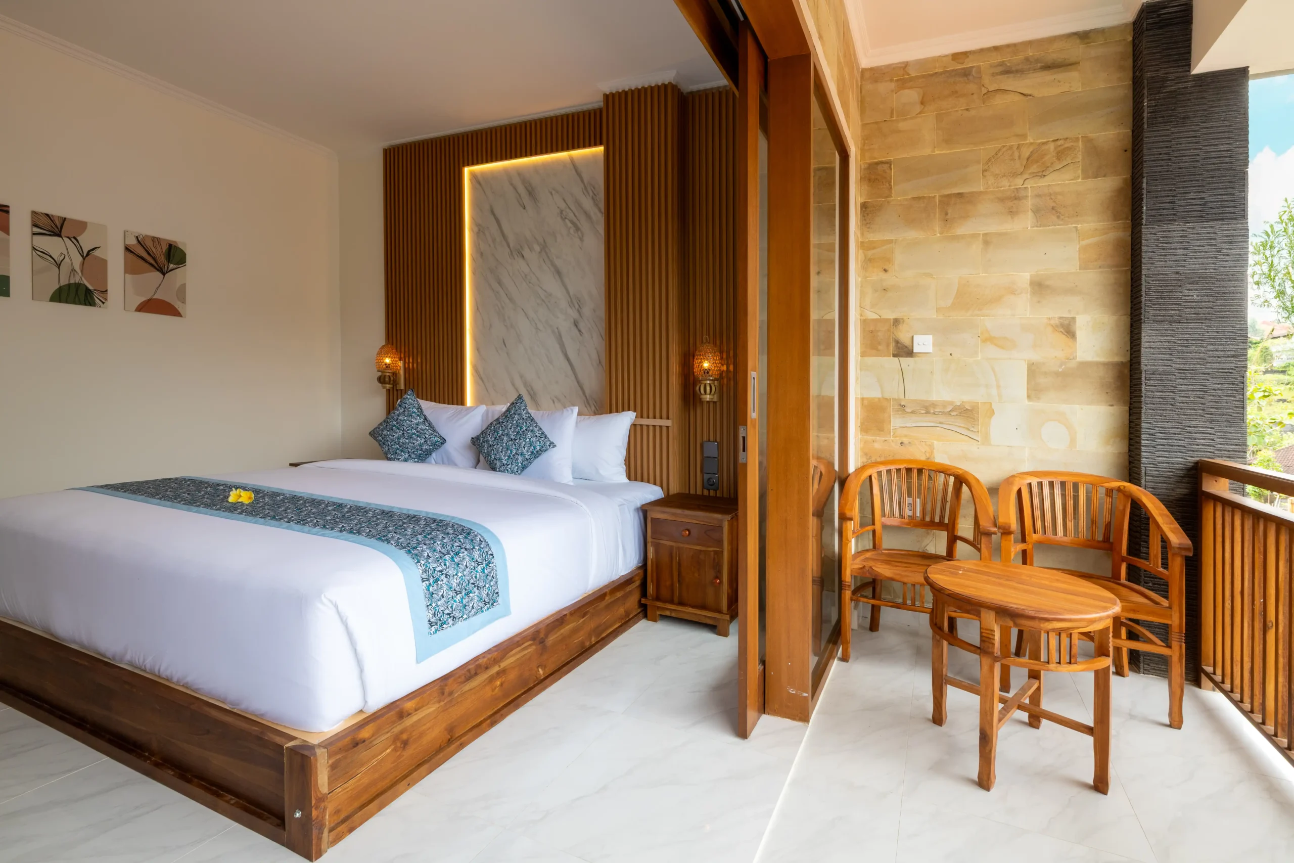 A stylish room with natural wooden touches and a spacious King Bed. Offering access to a private sitting area, complete with Free WiFi and a comfortable shower, ideal for a laid-back getaway in Uluwatu.